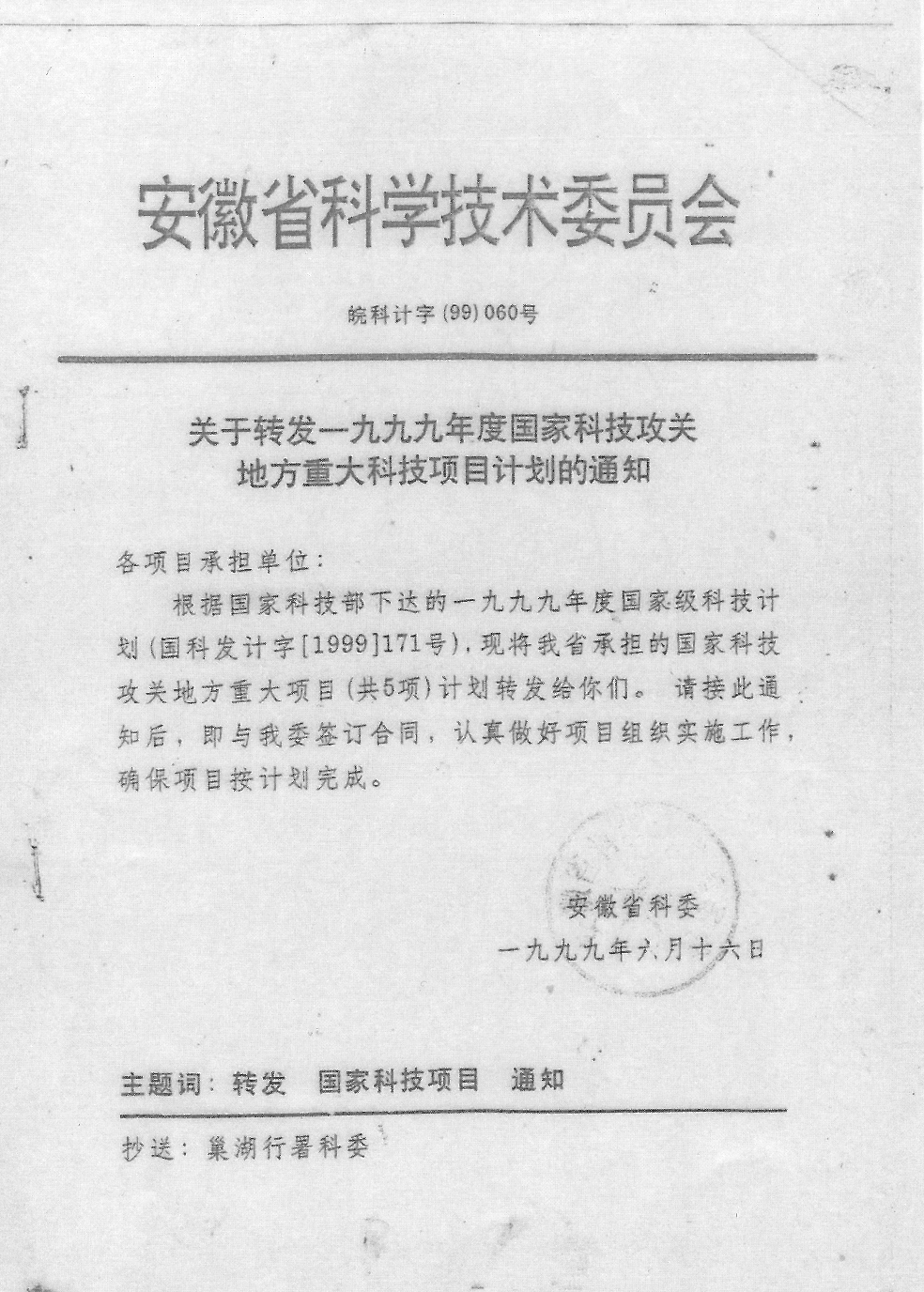 安徽省科學(xué)技術(shù)委員會(huì)國家級(jí)地方重大項(xiàng)目